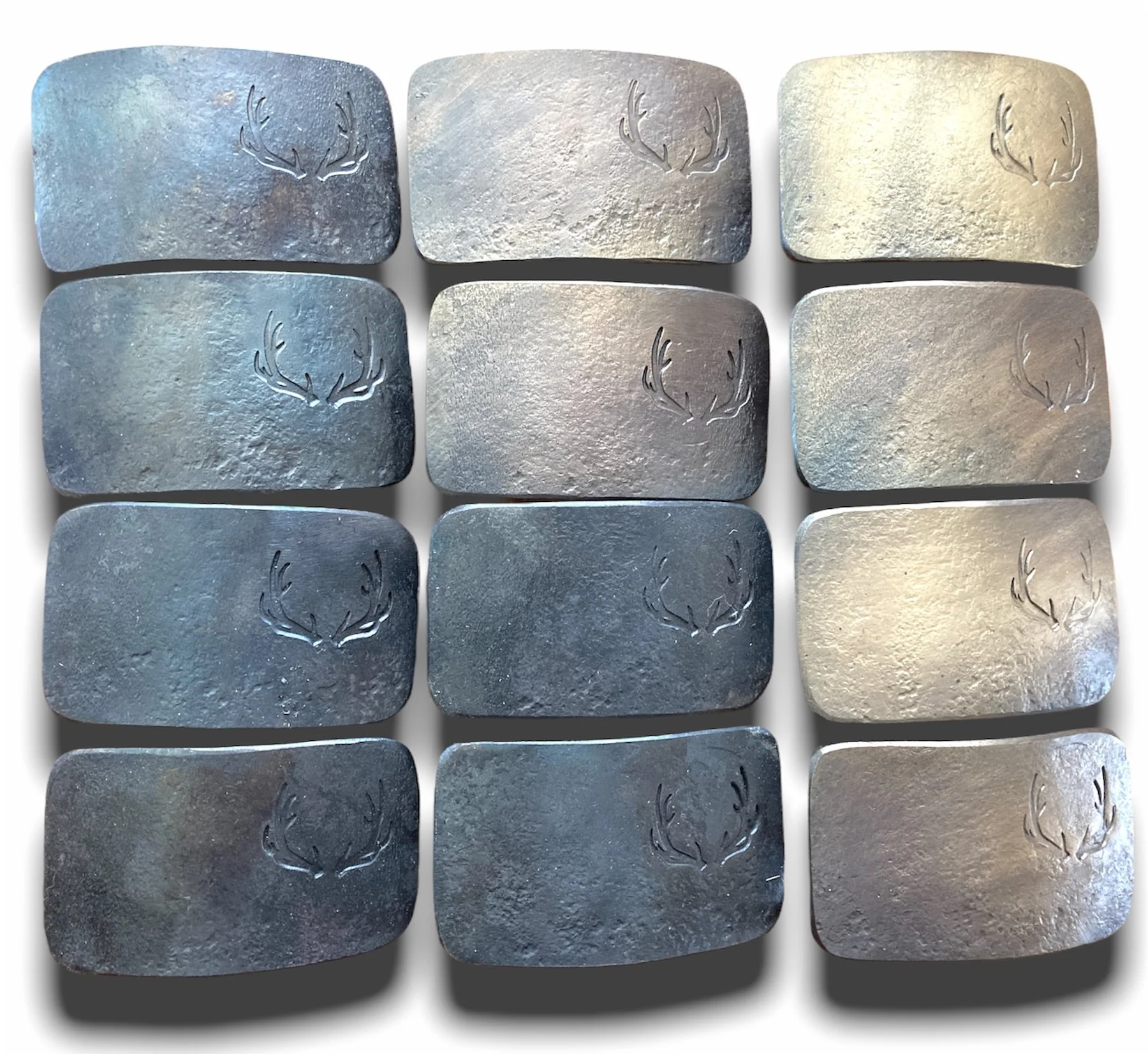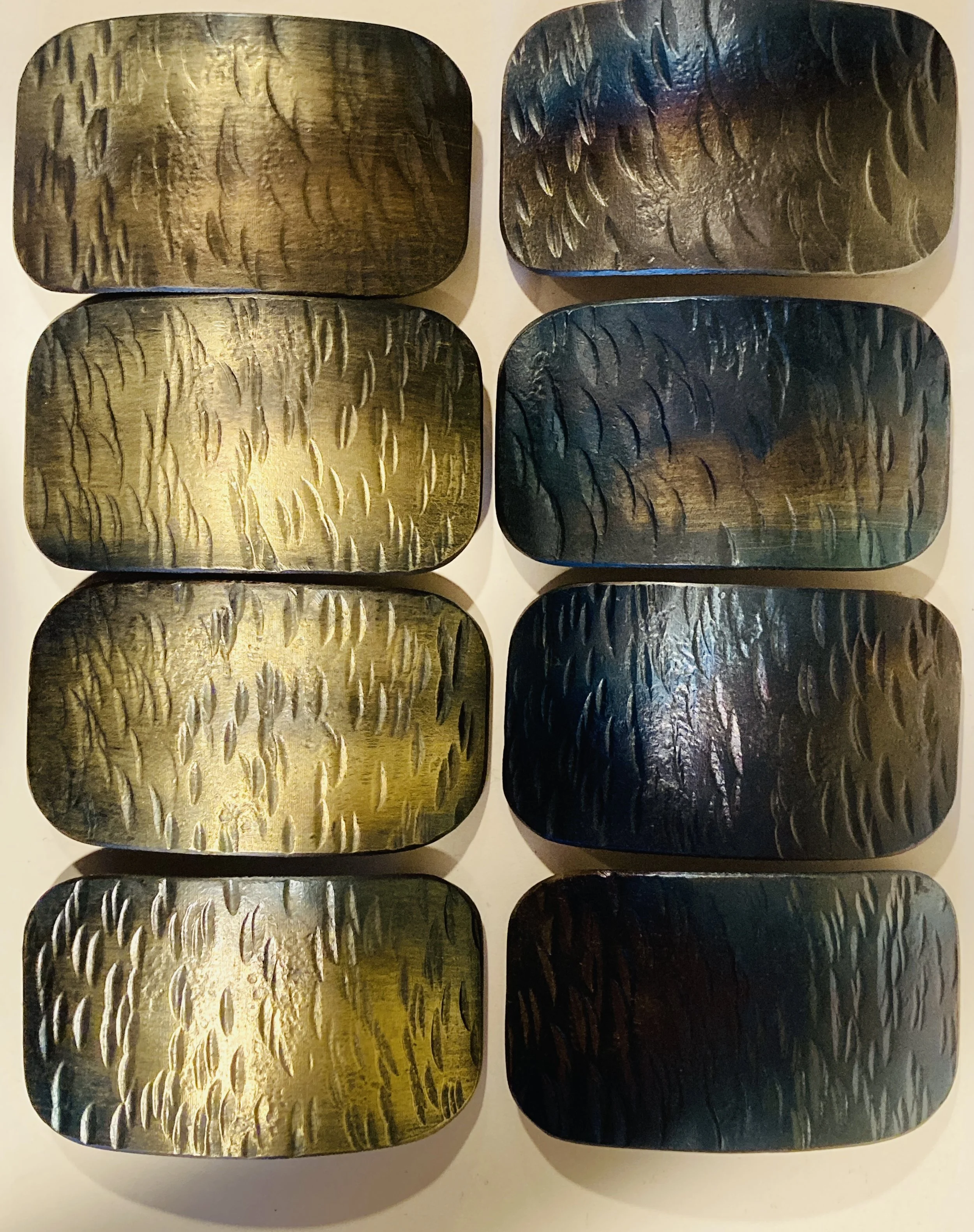 “Elkhorn” hand-forged belt buckle. The color gradient shown here is achieved by uniform heating of the buckle to a specific temperature before ‘arresting’ it with a quench.
