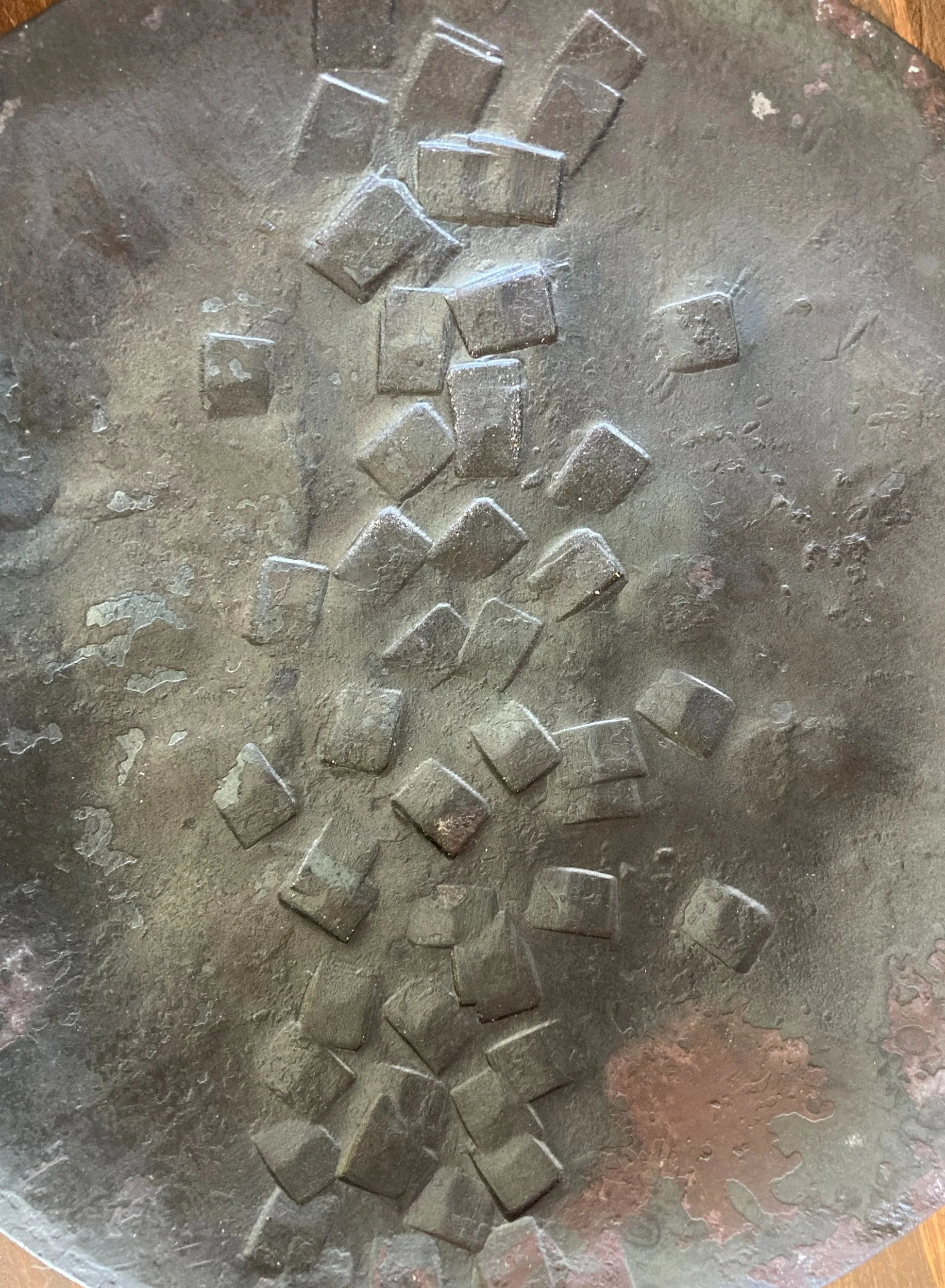 Square punch marks tested on a a small hand-forged dish. I made a standard, handled square punch which was used to assess a pattern of square marks. Looking forward to applying this technique to belt buckles (and light-switch plates) later this winter.