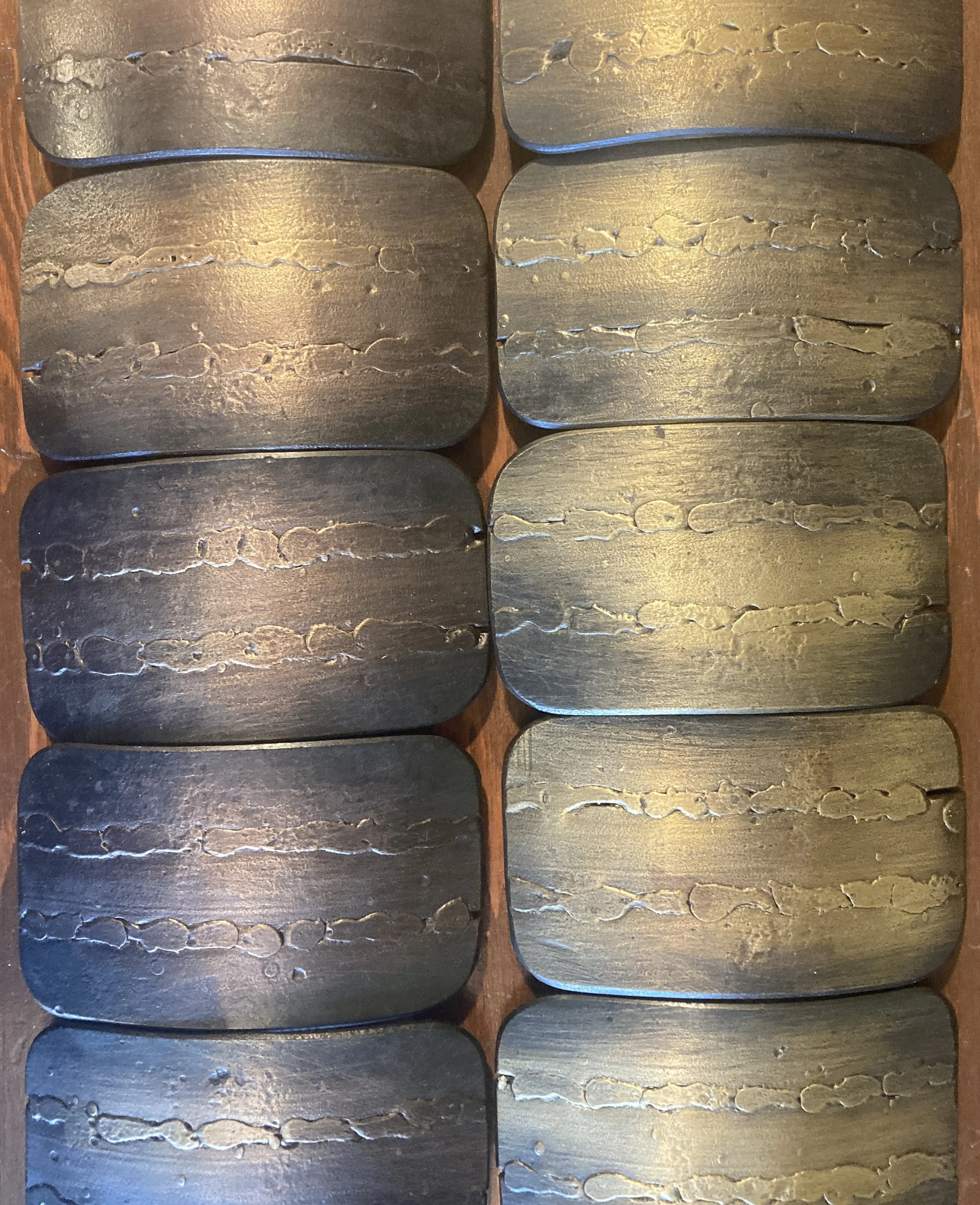 ‘Welded Panels’ hand forged belt buckle. This is one of my favorites. Here, strips of steel are fused via sloppy weld beads. I then forge them flat to get this unique texture.